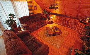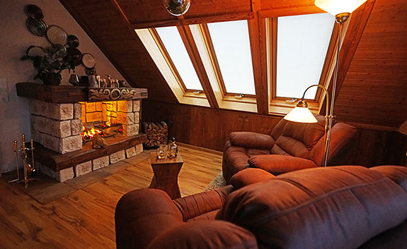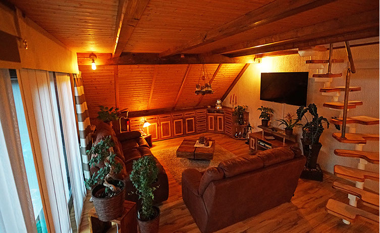 Komfortferienwohnung in der 2. Etage, 128 Quadratmeter, Wohnzimmer mit Chalet-Atmosphäre: Ideal für bis zu 4 Personen. Schlafzimmer 1 mit Doppelbett, Schlafzimmer 2 in der Dachspitze mit Doppelbett, Wohnzimmer: 1 Schlafsofa, weitere Räume: Küche, Bad/WC, Flur, Balkon