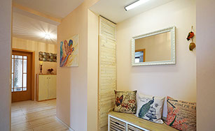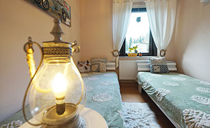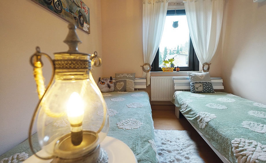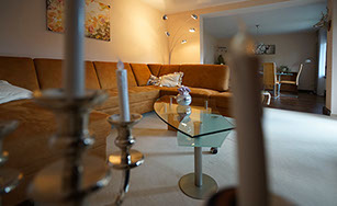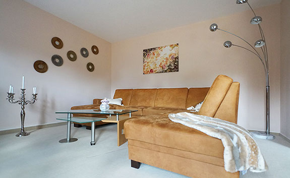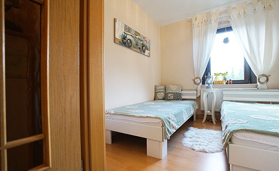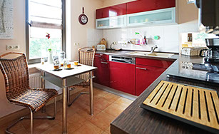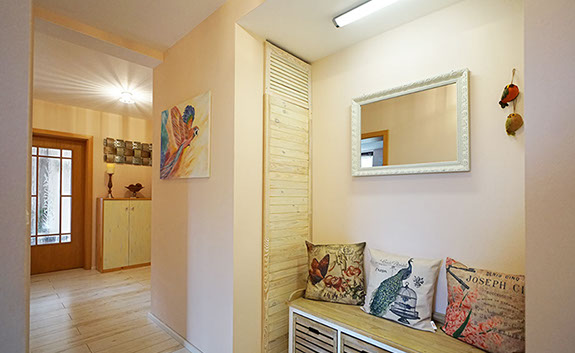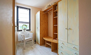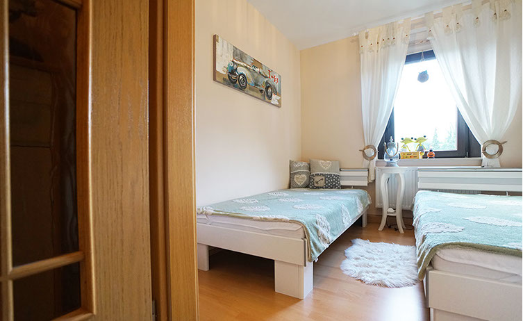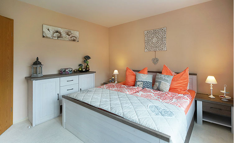 Komfortferienwohnung, 109 Quadratmeter, 1. Etage: Ideal für 2 bis 4 Personen, 6 Personen möglich. Schlafzimmer 1: 2 Einzelbetten, Schlafzimmer 2: 1 großes Doppelbett, Wohnzimmer: 1 Schlafsofa, weitere Räume: Küche, Bad/WC, WC, Flur, Balkon
